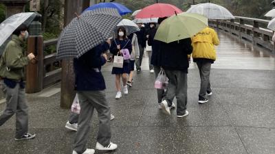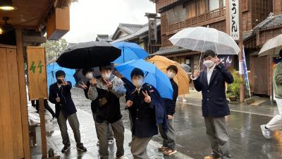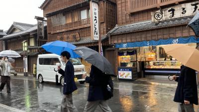2日目は伊勢神宮を参拝しおかげ横丁を巡りました。雨の中、傘を差しながら風情を楽しみました。