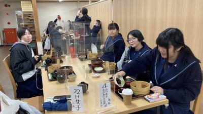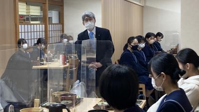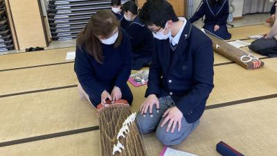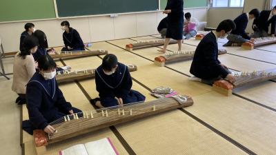 1年生普通コースの音楽授業で箏を演奏しました。初めて演奏する生徒もいましたが、響きのある美しい音を奏でていました。最後にはみんなで[さくらさくら]と[テンテマリ]を演奏し一年の締めくくりとなりました。