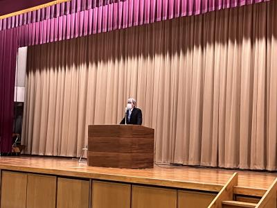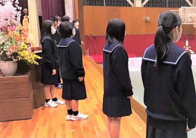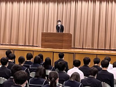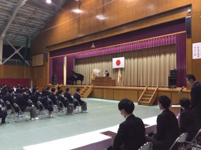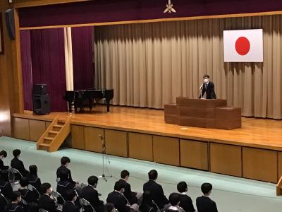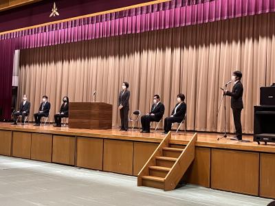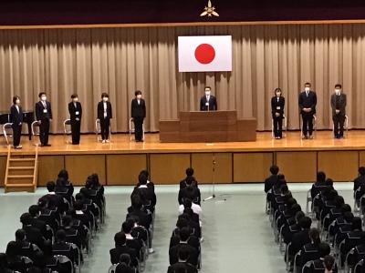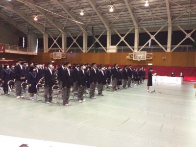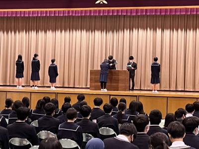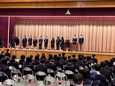 今年度も早いもので終業式の日を迎えました。まん延防止等の措置は解除されましたが、引き続き感染症対策を講じながらの実施となりました。終業式に先立ち来年度の生徒会役員任命式、表彰伝達式、皆勤者の表彰、図書利用の多読者の紹介がありました。終業式では校長先生が1年を振り返ることを通して「過去は変えることができないが、未来は過去の経験・反省を生かして切り拓くことができる。」と今後の活動に期待を込められました。また、退任される赤尾教頭先生からは、「生きていく上での様々な人や物事との出会いには必ず意味がある。」「苦手であるような出会いは、自分自身を変えるチャンスである。」という前向きな指針をいただきました。