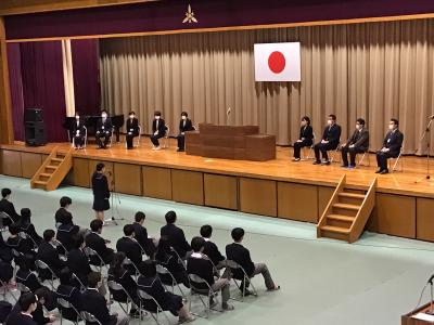 4月8日(金)、新2・3年生は朝の登校指導から始まり、生徒玄関前は朝から活気にあふれていました。午前は新任式、始業式、ホームルームを実施し、今後の予定について確認しました。午後は入学式を実施し、新たなメンバーを迎えて新学期が動き出しました。今年度の入学式はまん延防止等重点措置が解除されたこともあり、感染対策に留意しながら辰巳丘伝統の国歌の独唱を行ったり、式後の合唱部による学生歌の披露、新入生代表による記念演奏(ピアノ独奏)も実施できました。式の中に生のきれいな音が加わることにより、とても鮮やかな色どりがある入学式でした。