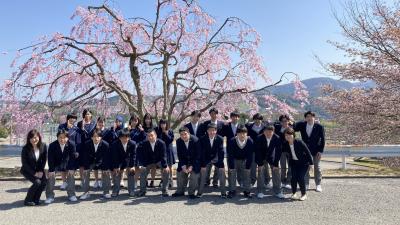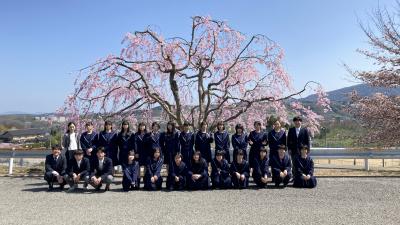 4月12日、本校玄関前にあるしだれ桜の前にてホーム写真を撮りました。壮大な青空と色鮮やかな満開の桜と共に撮影でき、一年の良いスタートを切ることができました。