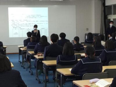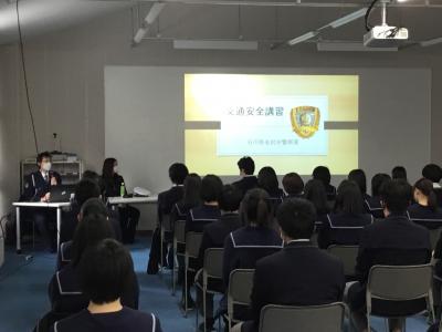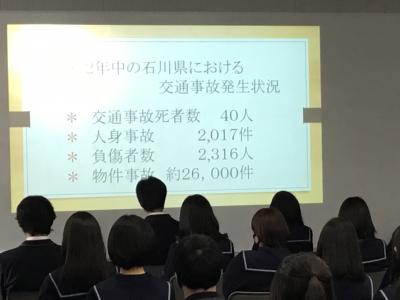 2月10日(木)の3年最終登校日に3年生全員を対象にして石川県中警察署の山本さんを講師に迎えて「交通安全講話」がありました。道路交通法、年代別免許保有率と交通事故、令和2年中の石川県における交通事故発生状況、損害賠償例など、様々な事例やデータを用いて、車を運転することの重大性などについて分かりやすくお話をしていただきました。