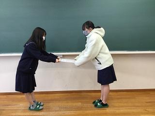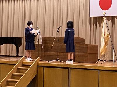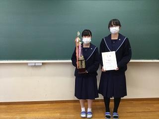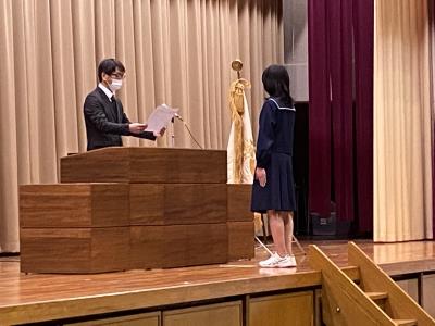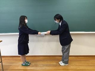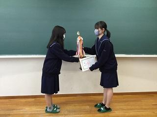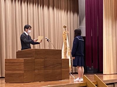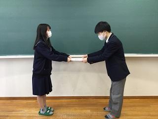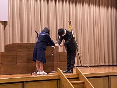 生徒会記念品贈呈式(3年大井 久恵さんと2年神井田緋姫さん)