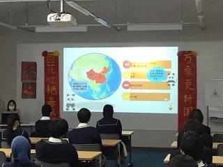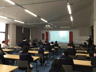 2月17日(木)の6、7限目に、本校2年生76名がコロナ感染症対策のため、2グループに分かれて、前半と後半で交替し、アクティブラーニング教室と音楽ホール両会場で春節交流会を行いました。春節とは中国で最大の祝日です。アクティブラーニング教室では、金沢市国際交流員の田玲さんが中国文化を紹介してくれました。中国の学校教育や春節行事や食文化など、いろいろと話をしてくれました。近くて遠い文化に触れ、生徒たちはとても興味を持っている様子でした。また、音楽ホールでは、二胡愛好会の3名による二胡の演奏がありました。中国の伝統的な曲「モリハ」やジブリ映画「千と千尋の神隠し」の主題歌の「いつも」など、何曲も演奏していただきました。生徒が直に中国の古典楽器の素晴らしい音色に感動している様子でした。各会場で最後に、生徒代表が田玲さんや二胡愛好会の方々に挨拶し、感想や感謝の気持ちを伝えました。中には中国語で挨拶した生徒もいました。春節交流会を通して、生徒たちは中国文化を身近に感じるとともに世界の広さを知り、国際社会に触れる一つのきっかけとなりました。