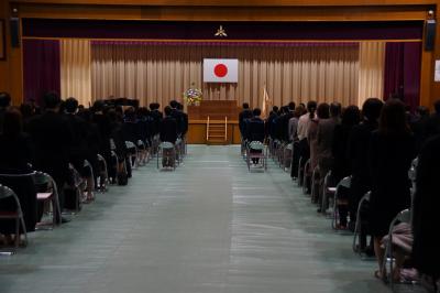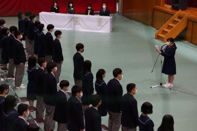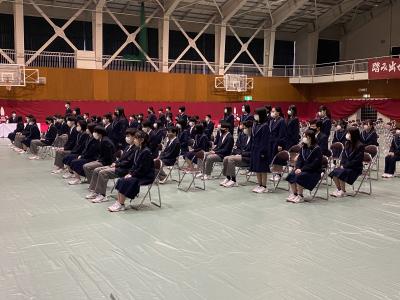 3月2日(水)、3年生84名の卒業式を無事終えることができました。諸事情で出席できない生徒・保護者の方もおられましたが、式に臨んだ3年生は元気に巣立っていきました。式辞では、学校長がオリンピックを引き合いに出し、勝敗はさておき、難しいことに果敢にチャレンジしてほしいと激励されました。卒業生答辞では、代表の上田乃々佳さんが3年間の感謝とともに、これからはしっかりと自立していく決意を述べました。
