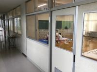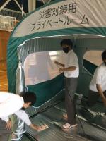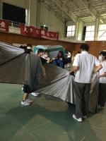 講師である金沢市危機管理監危機管理課職員の方々のご指導の元、実際の避難所で使用する「簡易テント」と「簡易間仕切り」をグループごとに組み立て実習を行いました。