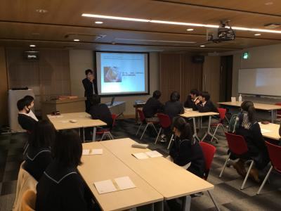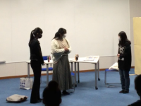 最初に管理部人事課係長の宮吉様から会社についての説明を受けました。箔一についていろいろな角度から詳しく説明していただきました。次にお箸に金箔を巻き付ける体験をしました。生徒たちは手際よく金箔をお箸に巻き付け、終始、楽しそうでした。