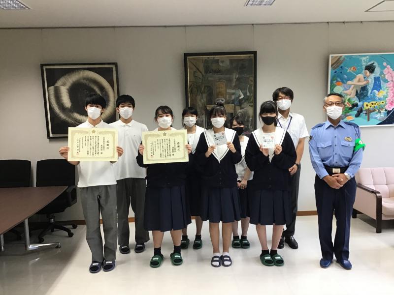 本校の放送部と演劇部の協力により完成した広報啓発用CDの製作協力に対して石川県警察本部からの感謝状贈呈式が8月25日(火)の午後4時から本校校長室でありました。このCDは、青色回転灯装備車がアナウンスを流しながらパトロールを行い、各種犯罪被害防止、交通事故防止に活用されています。