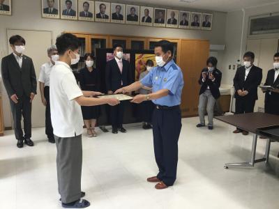 5月26日の夕方、水道君が下校途中に高齢者の方から道を尋ねられました。高齢者の方の雰囲気に不安を感じたので、水道君はただ道順を教えるのではなく目的地まで送ろうと思ったそうです。(一緒に歩いた距離は約4.2km)忙しい毎日の生活の中で、自分のことを中心に考えがちですが、水道君の判断のおかげで、高齢者の方(行方不明届けが出されていた)は、無事家へ戻ることができ、家族の方々が大変感謝しているとのことです。この行いに対して金沢中警察署より感謝状が贈呈されました。心温まる良いニュースでした。