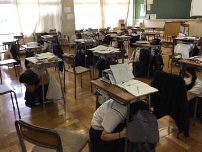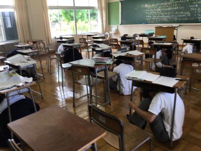 7月8日(水)に県民一斉の防災訓練(シェイクアウトいしかわ)が行われ、本校もその取組に参加しました。緊急地震速報を告げる放送に対して、落下物から頭や首を守るために机の下に隠れるなど、各自が安全姿勢を取りました。自分の身を守る行動について緊張感を持って取り組んでいました。