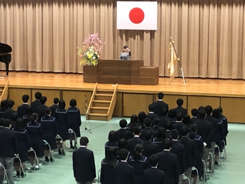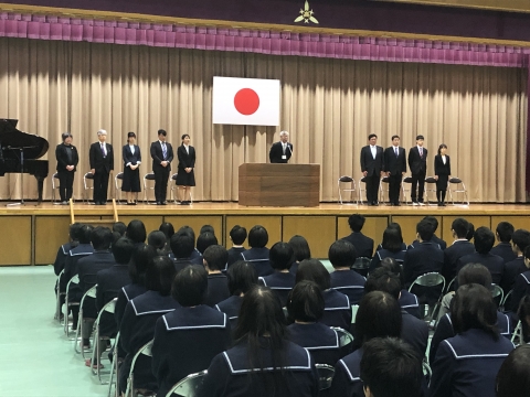 平成31年4月8日(月)、平成としては最後となる新学期がスタートしました。在校生にとっては、旧クラスに別れを告げ、進級した学年での新しい生活の始まりです。当日は始業式に先立ち、新任式が行われました。式では学校長が新任教職員を紹介し、新任者代表(田中教頭)挨拶の後、生徒会長(上村宏美)が歓迎の言葉を述べました。