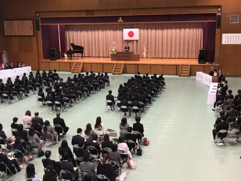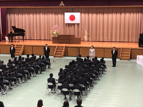 午後には、入学式が挙行され、99名の新1年生を迎えました。桜も開花し、春らしい雰囲気が感じられる中、一人ひとりが大きな希望と期待を抱き、緊張の中にも清々しい表情で式に臨む姿が印象的でした。