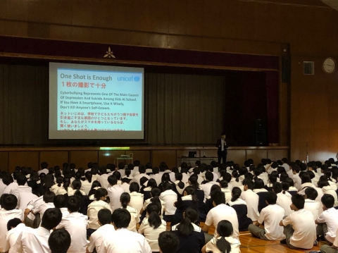 終業式前に行われた全学年対象の非行防止教室では、金沢中警察署、教育委員会学校指導課の方から、日常生活の中に潜む危険について具体例を交えてわかりやすく解説していただきました。「社会的に見て一番問題となる少年非行は何?」、「このようなケースはいじめに該当するかどうか?」など講師からの問いを考えながら、相手を思いやることの大切さを再認識しました。「ネットいじめ」に関しては世界的にも問題になっており、ユニセフの「ONE SHOT IS ENOUGH」というキャッチコピーが印象に残りました。