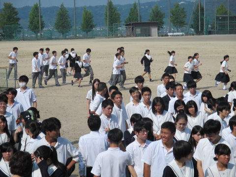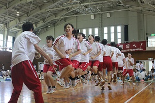 7月18日、今年度前期スポーツ大会が盛大に行なわれました。今年の種目は女子バレー、男子サッカー、クラス対抗綱引きと大繩跳びでした。体育館にてバレー競技、運動場ではサッカー競技に多くの生徒が熱戦を繰り広げ、また応援の生徒たちも拍手と歓声で大いに盛り上がりました。三年生にとっては、最後のスポーツ大会になり、忘れられない思い出が一杯詰まった行事になったことでしょう。