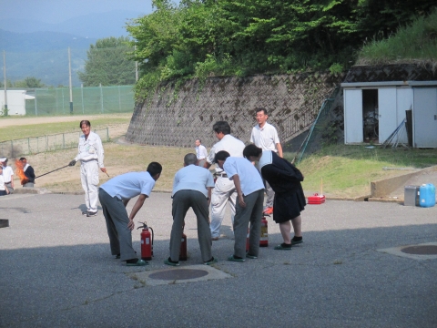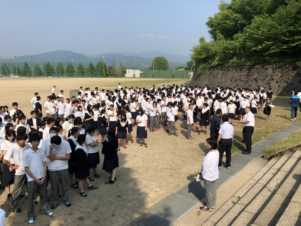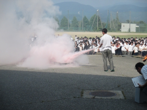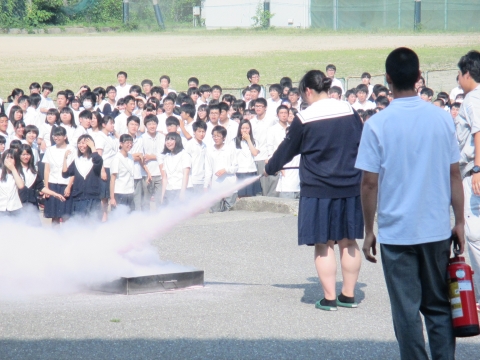6月25日(月)の7限目(総合学習カリヨン)の時間に中央消防署小立野出張所等の協力をいただき、防災避難訓練を実施しました。地震発生後に、校内で出火したという想定の下、校内放送の指示により生徒の避難が始まりました。一部の3年教室ベランダから直接グラウンドへ出ることができる配置となっており、避難完了時間も早めであったと、消防署の方からご講評をいただきました。今後はさらに一人一人が真剣に、様々なことを想定しながら行動し、危険を回避する能力を身につけてほしいと思います。また、3年生のクラス代表生徒らによる消火訓練も行いました。