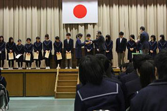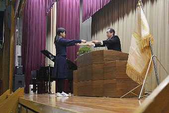 春蘭賞は、部活動、生徒会活動、ボランティア活動などにおいて校内外で優秀な業績や模範的な活動が認められた生徒に送られる本校伝統の栄誉ある賞です。その後、皆勤賞の表彰、多読者の表彰、新体力テスト優秀者の表彰、卒業記念品贈呈式、生徒会記念品贈呈式が行われました。