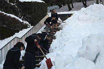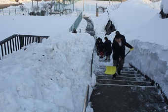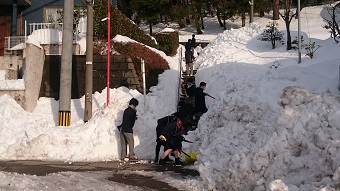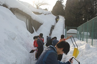 本校では積雪時、クラスや部活動単位での除雪が計画されています。これまでも朝、学校前の除雪は毎日のように行ってきましたが、今回の大雪で、本校周辺は大変な積雪となり、放課後の除雪隊も稼働しました。写真は末町住宅街で除雪車の入らない通路の除雪を行っている様子です。