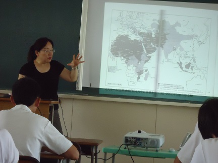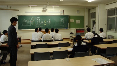 本校は、二年生から選択科目として中国語授業を最大12単位継続学べる県内唯一の高校です。一年時に中国や中国語について簡単な説明が行います。これは、本校の中国語オリエンテーションです。