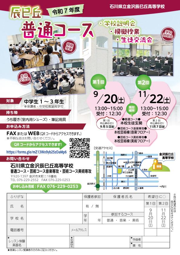 ・金沢辰巳丘高校の基本的な情報は学校紹介、芸術コースの詳細については芸術コース、日々の行事や活動の様子はスクールライフをご覧ください。