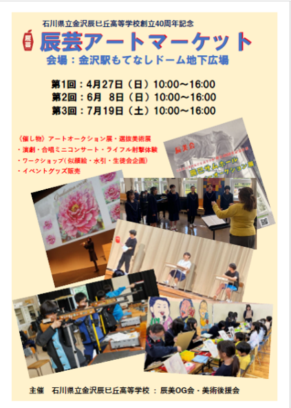 4/27(日)、6/8(日) 、7/19(土)の3日間、金沢駅もてなしドーム地下広場にて「辰芸アートマーケット」を開催します。いずれも10:00~16:00までですので、ぜひお立ち寄りください。