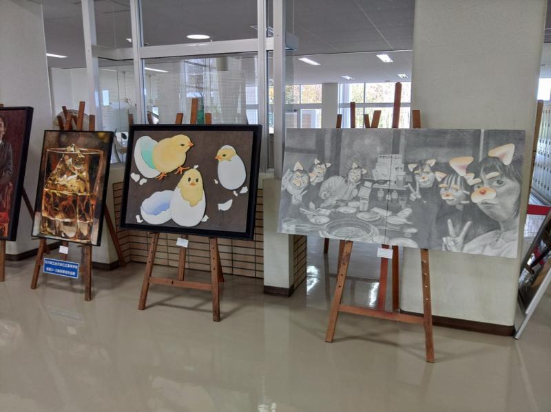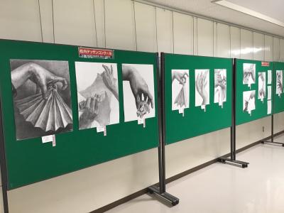 石川県高校総文美術展に出品した3年生の作品を校舎2階に展示しました。
