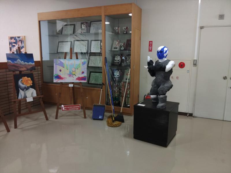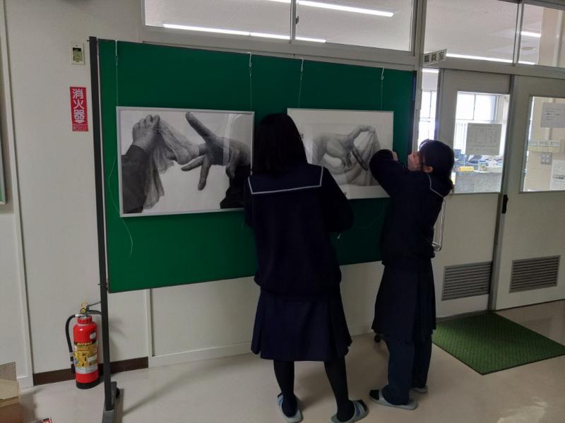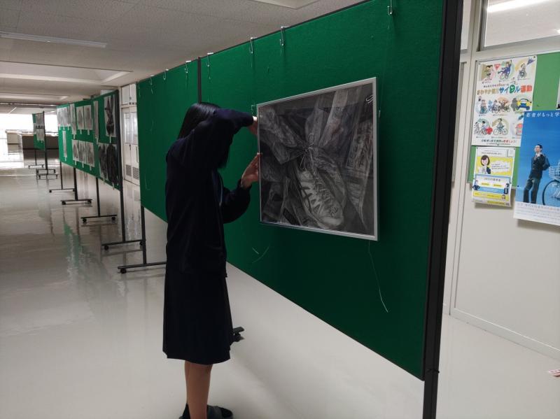 美術展で展示されていた作品が久しぶりに校内に戻ってきました。生徒たちが改めて一生懸命展示しています。
