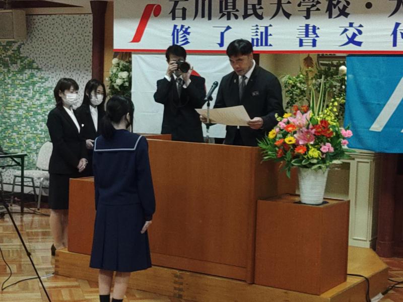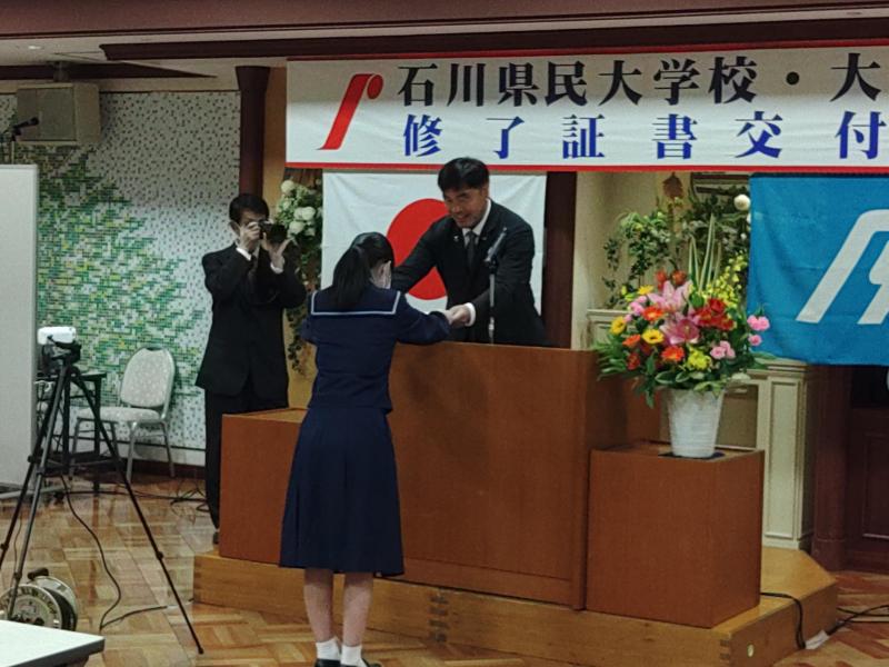 4月28日(日)、標記表彰式が本多の森庁舎(旧厚生年金会館)内の生涯学習センターで開催され、美術専攻2年生の宮本さんと出嶋さんが、馳知事から、それぞれ最優秀賞・優秀賞の表彰状と副賞をいただきました。