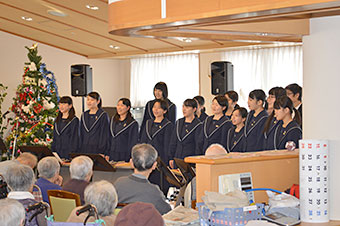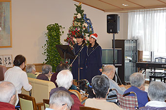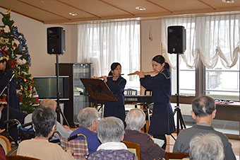 クリスマスにちなんだ曲を演奏させていただき、最後に皆さんといっしょに「お正月」、「ふるさと」を合唱しました。皆さんの笑顔がとても嬉しかったです。
