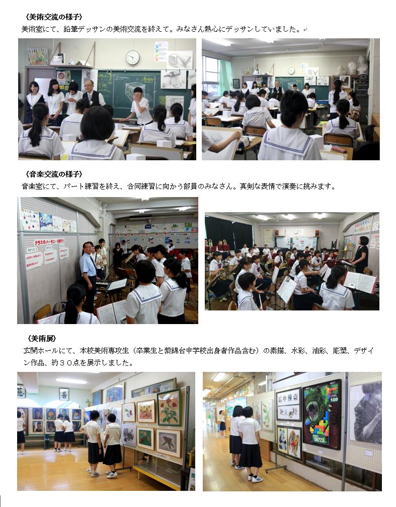 音楽交流はパートに分かれての練習後、音楽室で合同練習会を開き、部員一体となり演奏しました。また、7月2日(土)~7月15日(金)の2週間、本校美術専攻生の作品を紫錦台中学校の玄関ホールにて展示し、鑑賞していただきました。