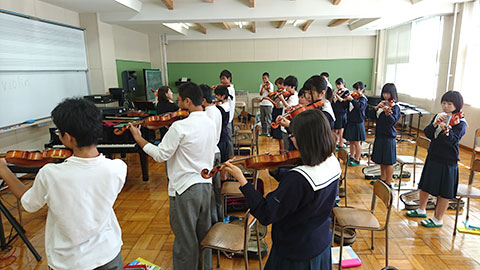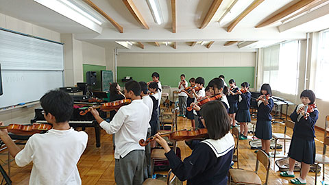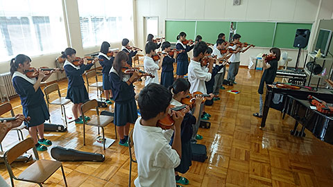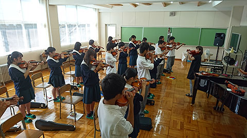 2学期に入り、1年普通コース音楽Iの授業でいよいよ弦楽器の授業が始まりました。普通コースの生徒は初めて持つ弦楽器にわくわく、ドキドキしながら授業に取り組んでいます。生徒からは「弦楽器ってこんなに持つの大変なんだ」とか「難しいけど、楽しい!」と、いろんな感想が飛び出しています。まずは「きらきら星」にチャレンジ!