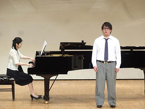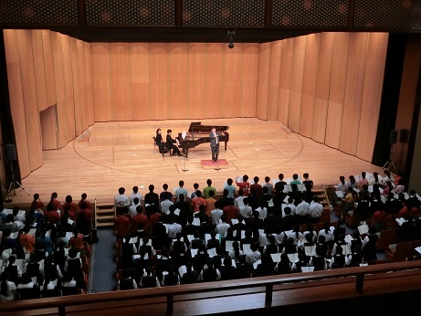 辰巳丘高校は男声の裏声(ファルセット)の練習のため歌っていた曲の「もののけ姫」と、この日のためにピアニストであるツナヨシさんに、アレンジしていただいた「にじいろ」などを歌ってきました。