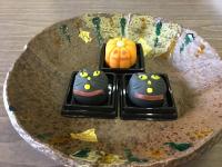 ハロウィンのかぼちゃと黒猫の和菓子でお抹茶をいただきました。
