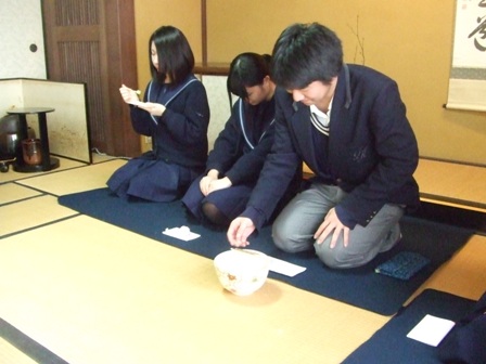 水曜日または金曜日に、講師の先生が来て、お茶のたて方やいただき方、その他の礼儀作法などを教えてくれます。