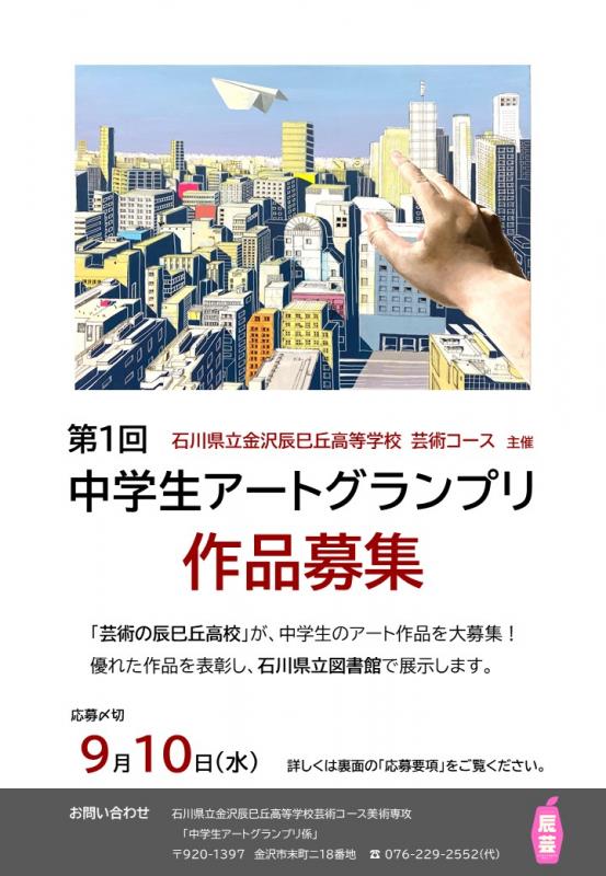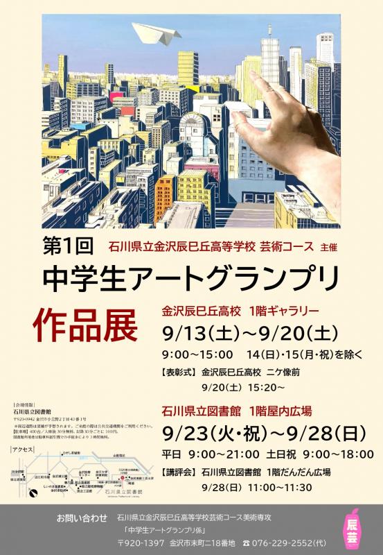 芸術の辰巳丘が中学生のアート作品を大募集!優れた作品を表彰し、石川県立図書館で展示します。石川県内の中学生であれば誰でも応募できます。【締切:9/10日(水) 】チラシ・募集要項はこちら(AGチラシ.pdf・AG募集要項.pdf)