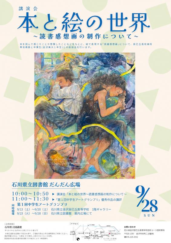 中学生アートグランプリの優秀作品5点(グランプリ2点、準グランプリ3点)の講評を、9月28日(日)11:00より、石川県立図書館で行います。また、これに先立って、10:00からは本校の美術教員が、「本と絵の世界」と題して、読書感想画についての講演を行います。詳しくは 中学生アートグランプリ優秀作品講評&講演会「本と絵の世界」.pdf をご覧ください。