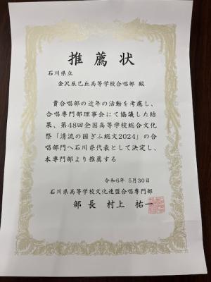 8月に岐阜県可児市にて開催予定の全国高等学校総合文化祭合唱部門の推薦状もいただきました。