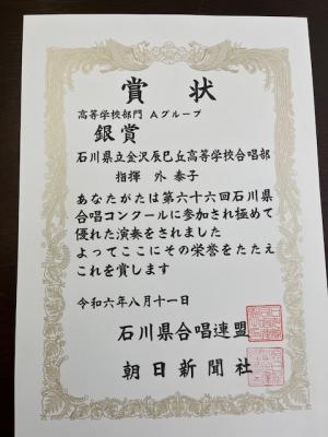 石川県合唱コンクール高等学校Aグループにて「銀賞」受賞。