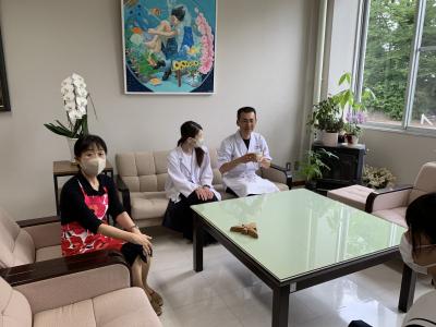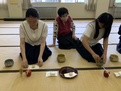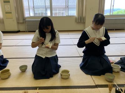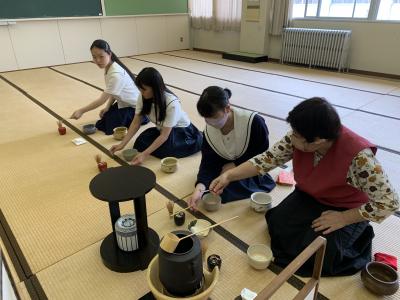 お昼休みに3年生が、行松さんと奥さんに お茶を点ててお出ししました。おいしいと言っていただけてうれしかったです。本校の校章のデザインの基になっている春蘭の描かれたお茶碗でお出ししました。