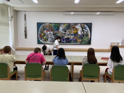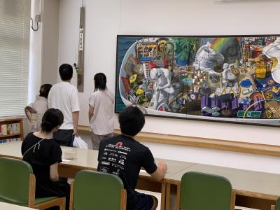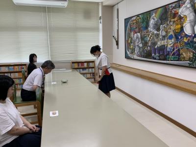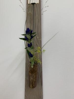 図書室の静かな空間で、正面には本校で油絵を教えてくださっている粕谷正一先生の『ハコブネ』という大作を置き、左手には垂発(すいはつ)に秋の草花・・・竜胆(りんどう)、藤袴(ふじばかま)、女郎花(おみなえし)などを活けました。