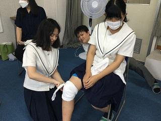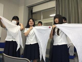 また、来週の救急法競技大会に向けて、三角巾を用いた傷の手当ての練習をしました。