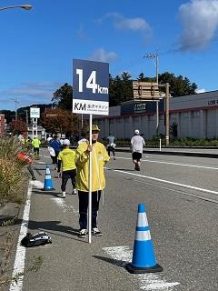 昨年と同じく14km地点を含む31区と32区で、走路・沿道班の沿道整理員と表示看板員を行ないました。