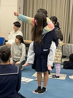(新聞じゃんけん。負けると新聞を折りたたんでいきます。ペアで最後まで新聞に乗っていられるかで勝負が決まります。)