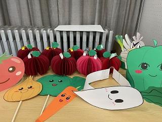 (ダンスの時に使う野菜のお面とお土産のりんごメダル。部員の手作りです。)
