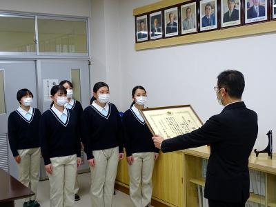 10月に行われた全国産業教育フェア全国高校生介護福祉研究発表会の表彰式が12月22日、校長室にて行われました。北信越地区代表として出場した 石倉 星さん(32H) 岡本 彩莉さん(32H) 楠 れいささん(32H)が受賞し、七尾市の取材も受けました。