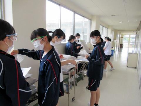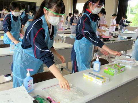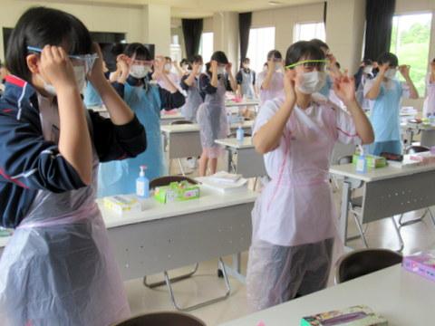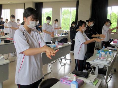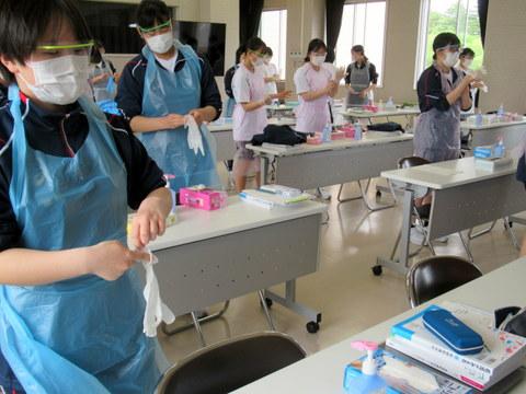 近々、スタンダード・プリコーションの実技評価が控えています。衛生看護科の看護臨地実習では、スタンダード・プリコーションは必須の看護技術です。素早く手指消毒し、ガウン等を汚染なく着脱しなければならないので、確実な感染予防技術の習得を目指します。クラスのみんなで協力し合い頑張っています。
