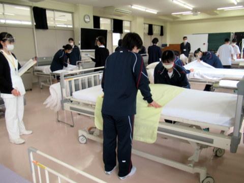 緊張しながら、ペアで必要物品をすべて準備して、15分でベッドメーキングと環境整備を行いました。練習の成果が発揮できた人もできなかった人もその後も技術の練習に励んで頑張っています。