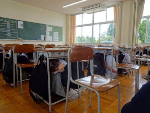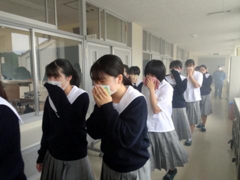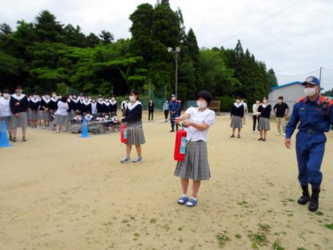 第1回定期考査4日目の終了後に、地震発生後に火災が起きたという想定で『防災避難訓練』を行いました。まず、地震発生後には、机の下で身を守りました。その後、火災が発生した設定で、火元を避け運動場へ避難しました。今年は発煙筒を用い、本当に火災が発生し、煙が充満したかのような雰囲気で訓練を実施することができました。校長、消防の方の講評の後、消火器の使用方法、初期消火について説明していただき、消火訓練も行いました。今は、生徒として避難誘導される側ですが、将来は、看護師・介護福祉士として、患者様・利用者様の避難を誘導する立場になります。そのことを意識した、意義ある訓練になりました。