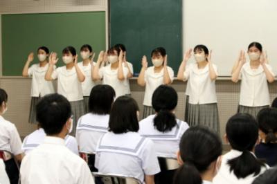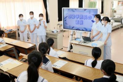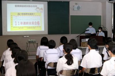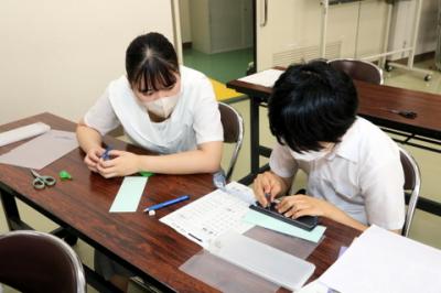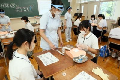 8月23日(火)体験入学を開催しました。衛生看護科、健康福祉科の概要説明、健康福祉科3年生による手話発表後、衛生看護科では、包帯法・創傷処置、手洗い感染予防具の着脱、健康福祉科では手話、点字の授業を体験しました。中学生は、積極的に参加していました。