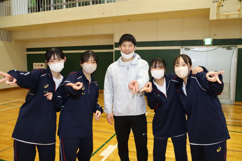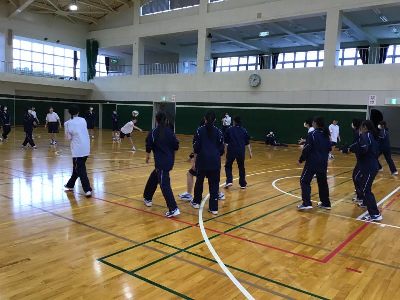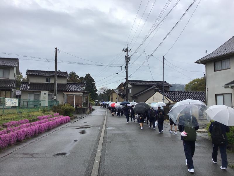 小雨のなかクラスメイトと話しながら歩いて田鶴浜体育館へ行きました。