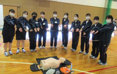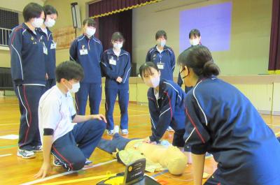 一次救命処置では、専攻科2年生がデモンストレーションを実施し、救急時の対応などを事例を通して実演しました。その後、専攻科2年生の指導の下、全員が一次救命処置の手技を練習しました。これからは、どの生徒も一次救命が必要な時には今日学んだ技術を発揮して、人命救助に活躍してくれることと思います。